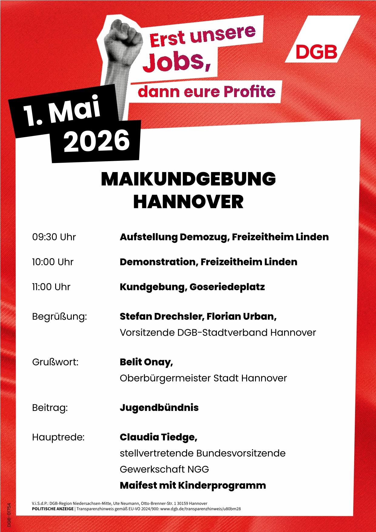 Der 1. Mai ist ein Tag des Zusammenhalts, der Solidarität, des Widerstands und des Einsatzes für den Frieden. Wir stehen gemeinsam für unsere Rechte, für unsere Würde und für eine gerechte Gesellschaft. Lasst uns laut sein gegen Angriffe auf Arbeitnehmerrechte, gegen Sozialabbau und gegen eine Politik, die die Interessen der Beschäftigten hintenanstellt.