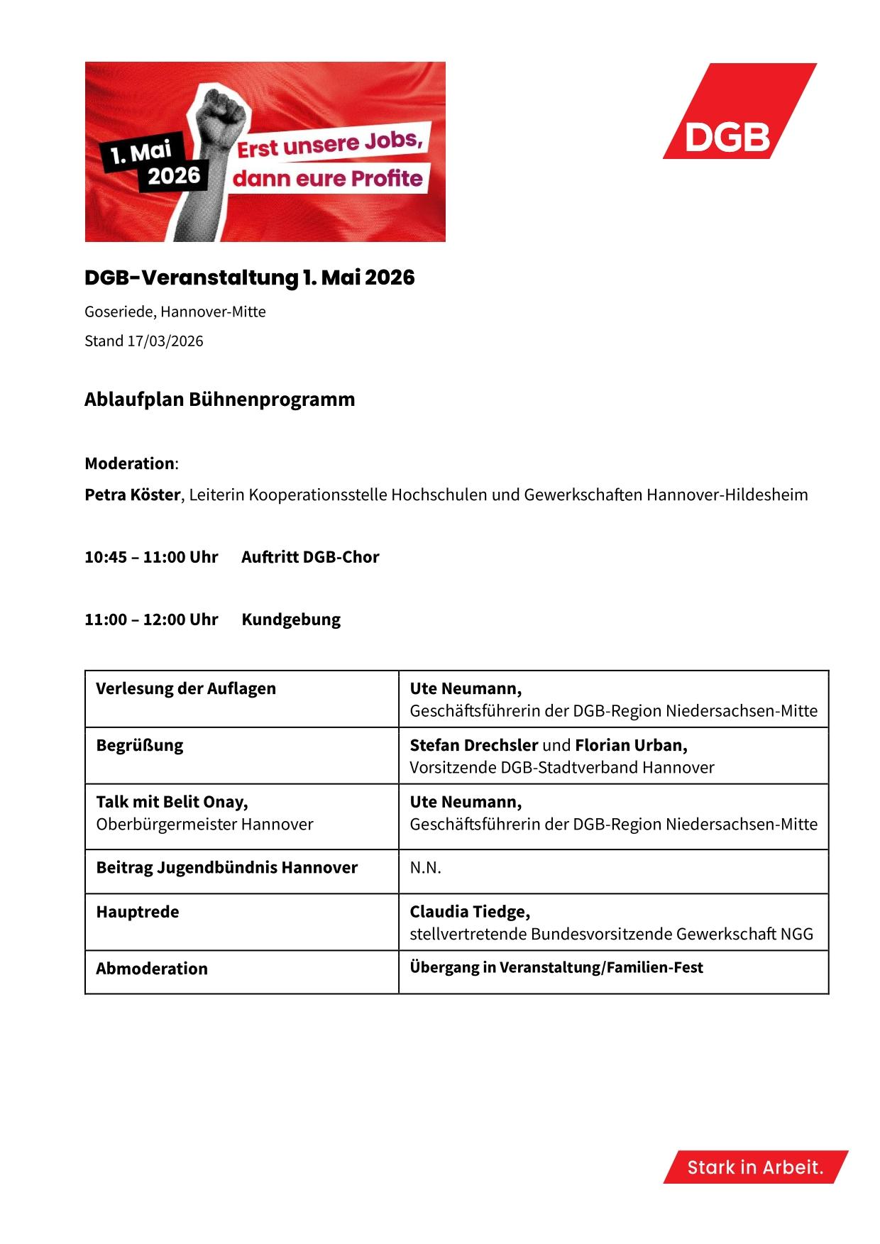 Im Anschluss an die Kundgebung findet auf dem Platz das Maifest mit Kinderprogramm statt. Im Festzelt der IG Metall gibt es ein Kuchenbuffet und Kaffee gegen Spende. Wir spenden in diesem Jahr an das Frauenhaus Hannover sowie an den Verein Gegen das Vergessen.
