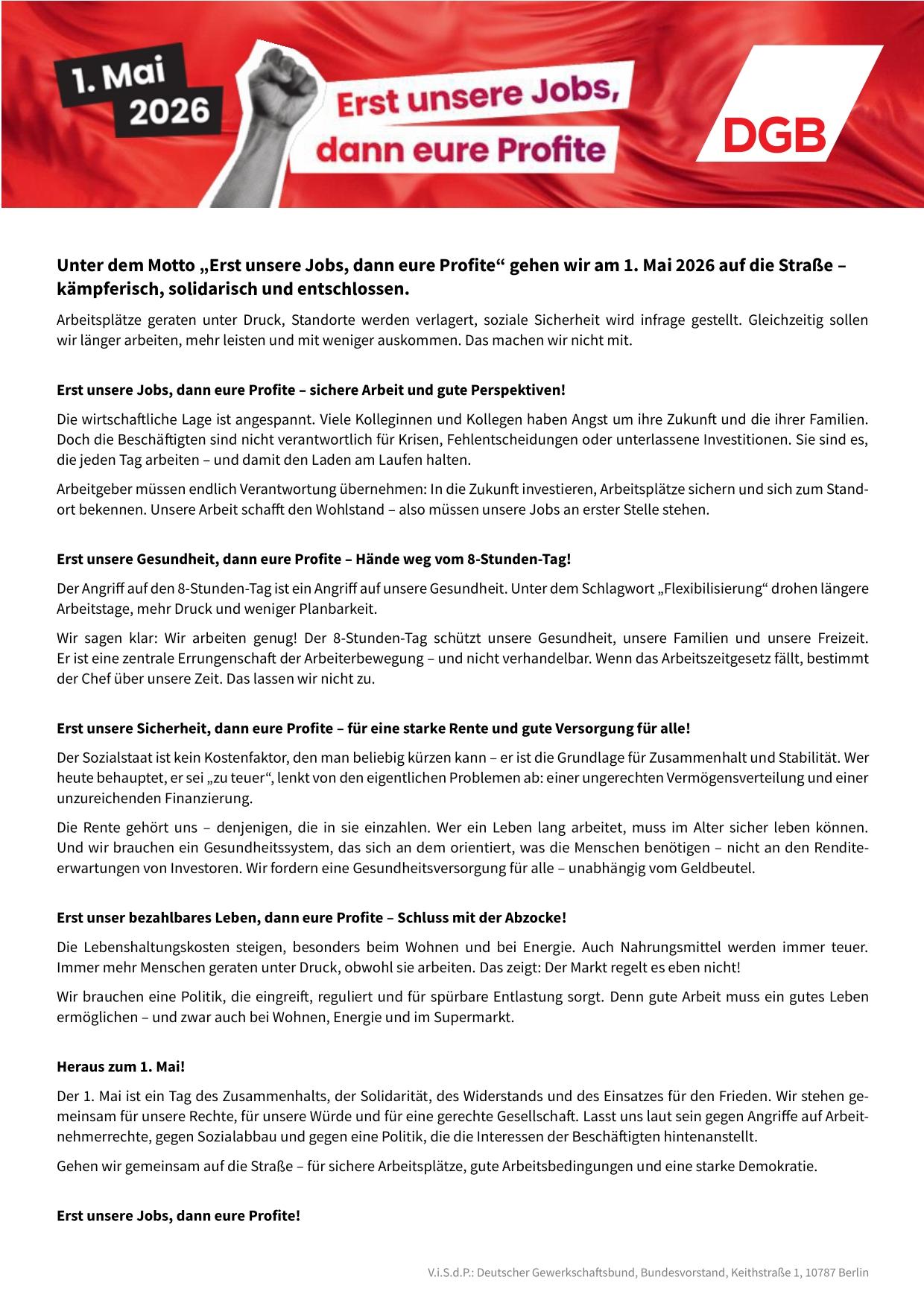 Erst unsere Jobs, dann eure Profite Heraus zum 1. Mai 2026!