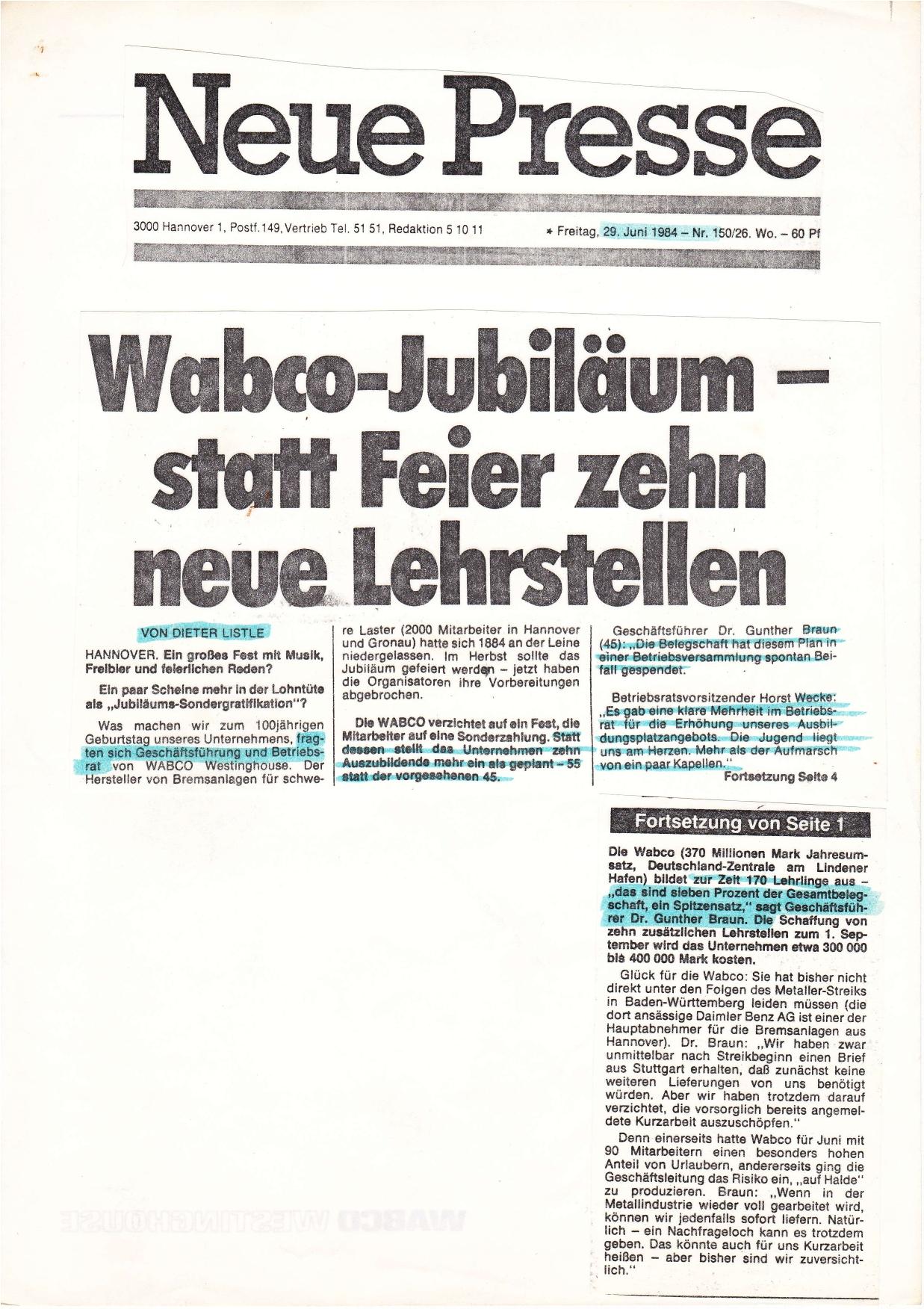 1984-06-29 WABCO mehr Lehrlinge statt Jubelfeier