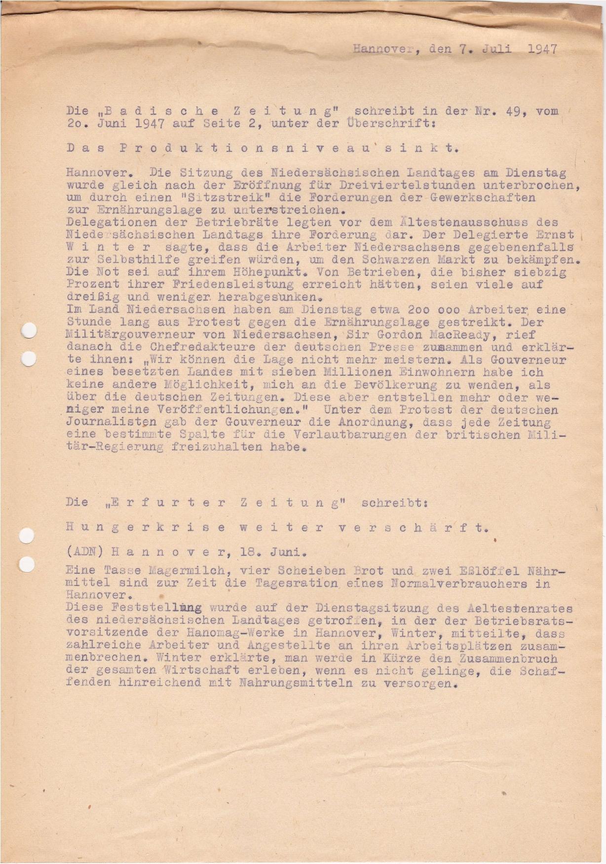 1947 Pressespiegel Hunger Hannover