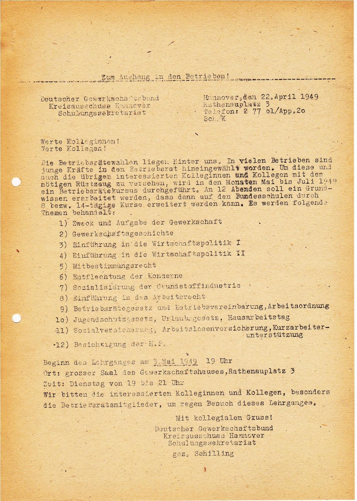 1949 Schulungsangebot DGB für Betriebe