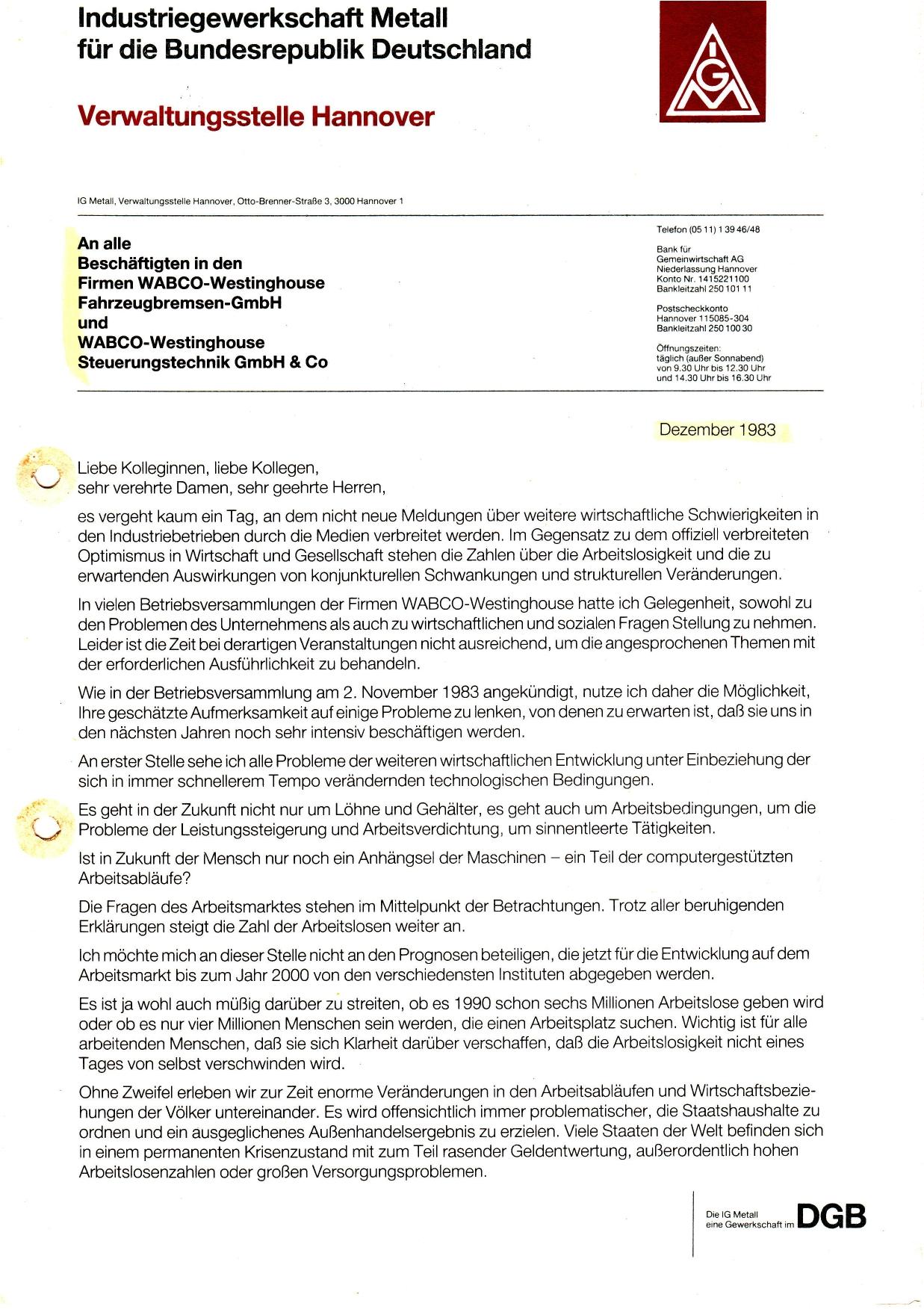 1983-12 Schreiben C. Wagner an alle WACO-Beschäftigten
