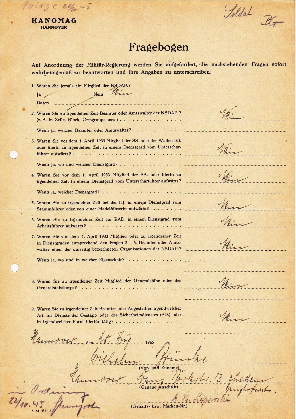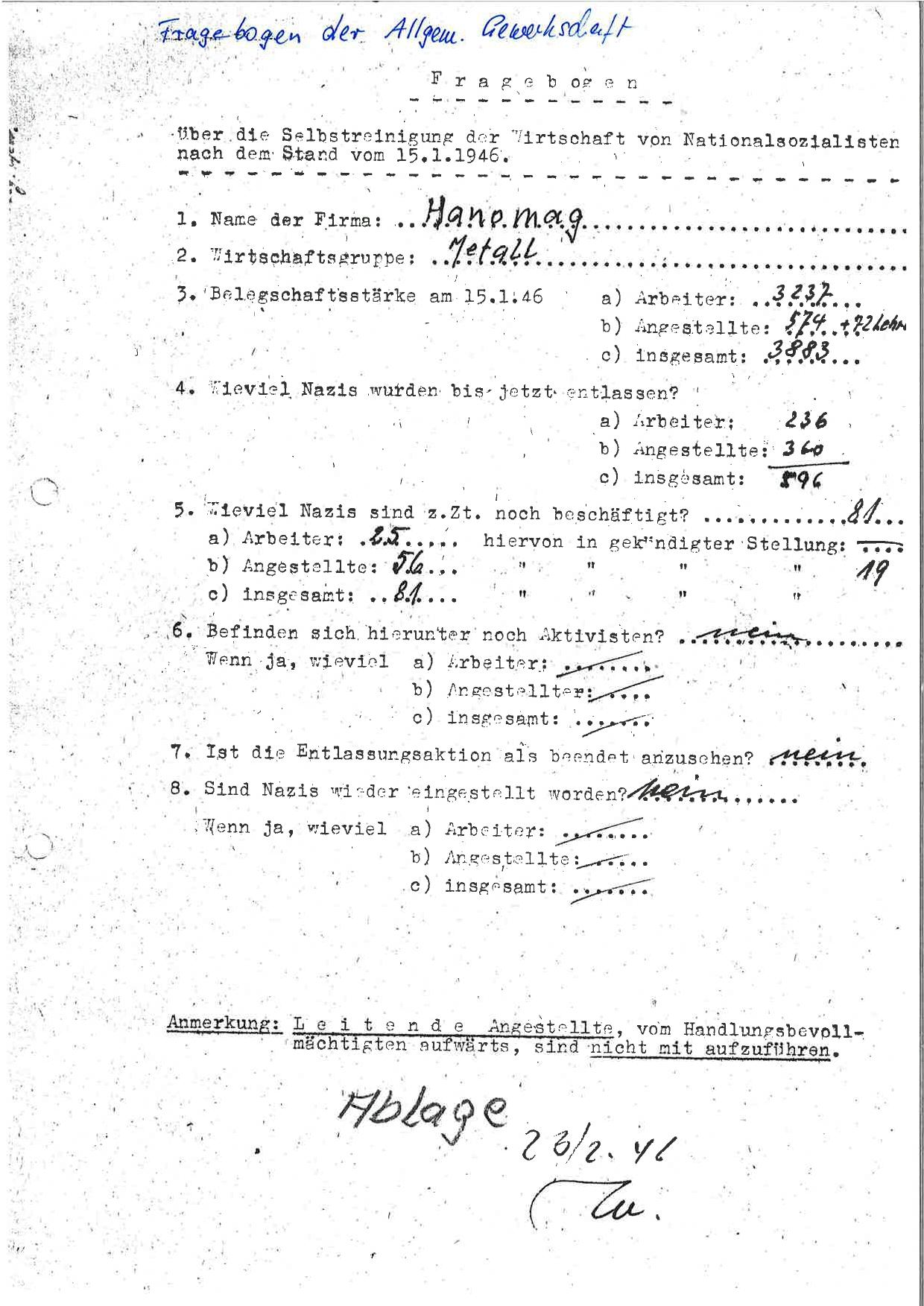 1946 Pol. Fragebogen Allg. Gew. Hanomag