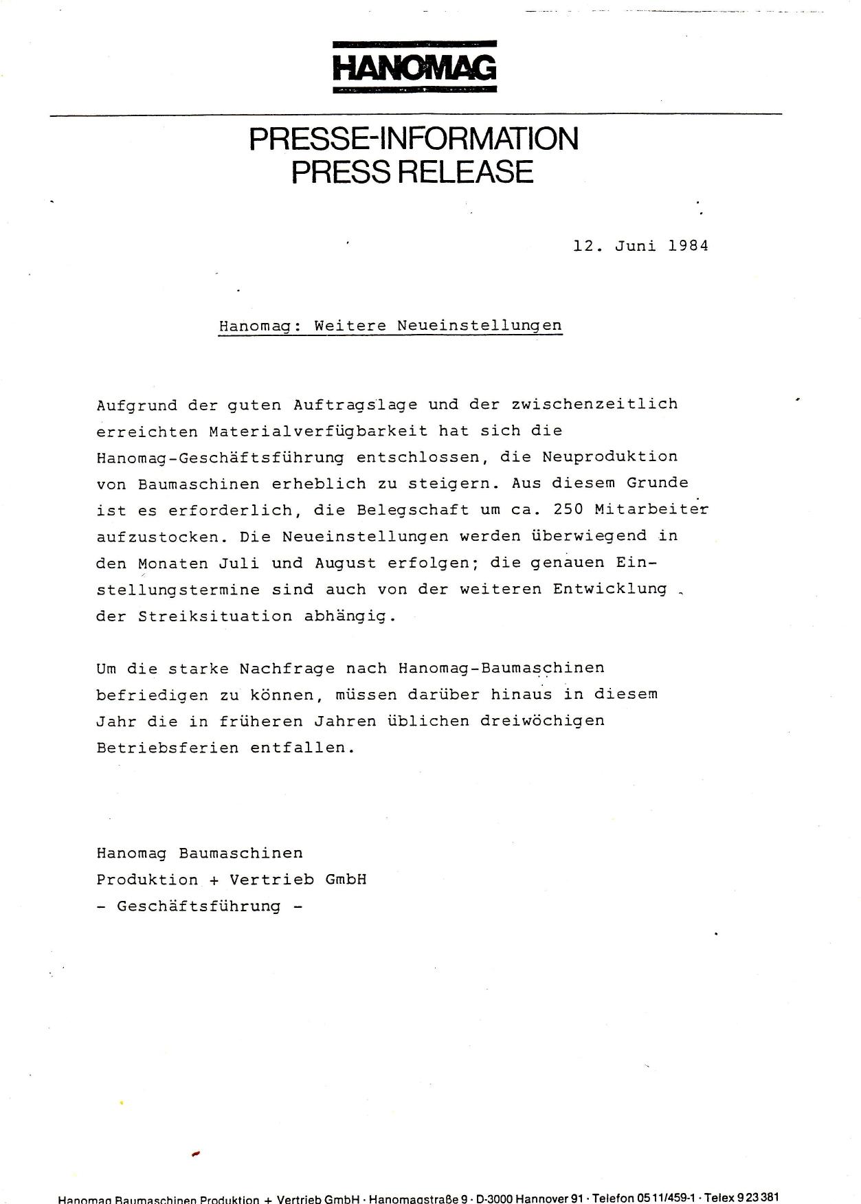 1984-06-12 Pressemitteilung zu Neueinstellungen