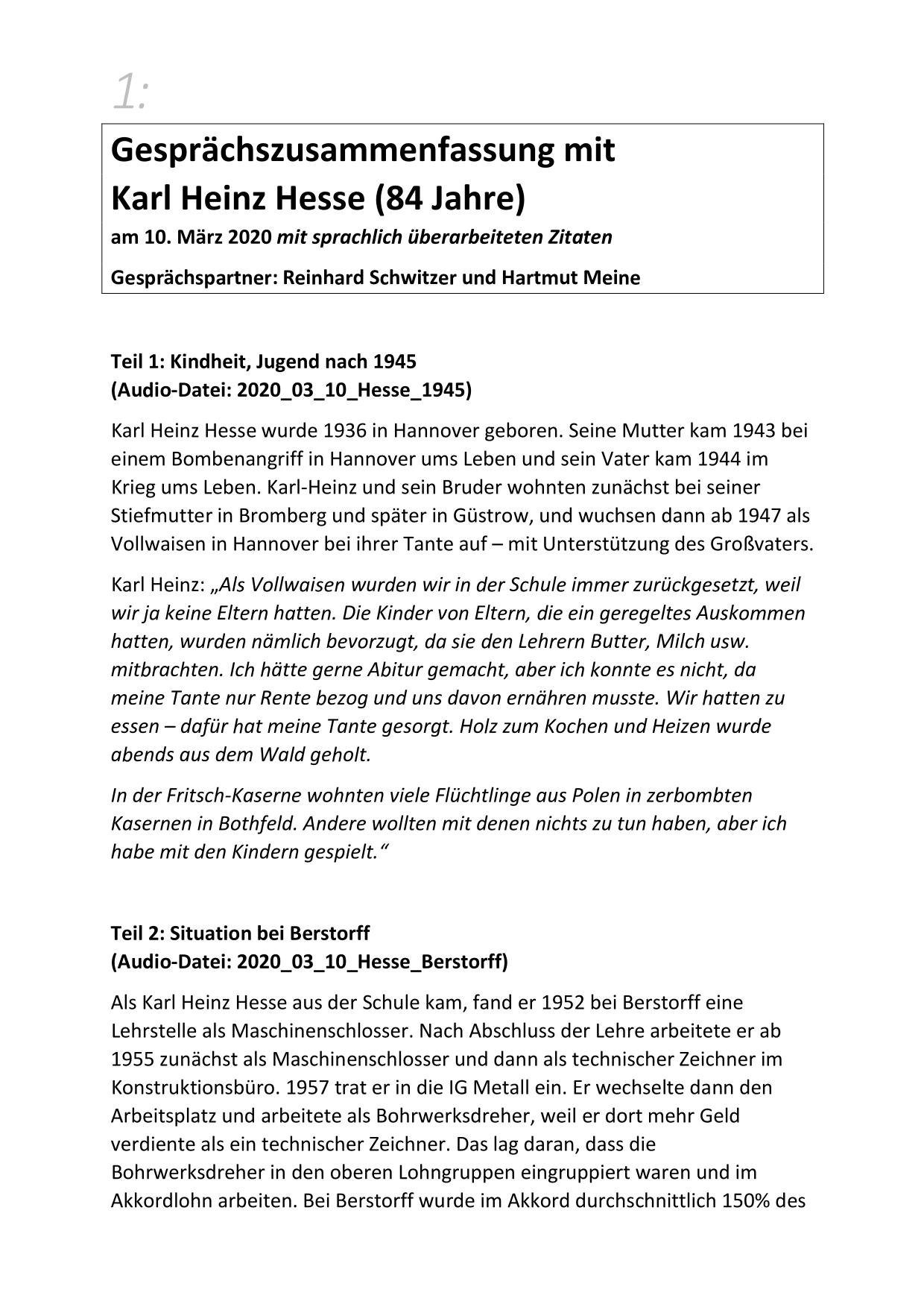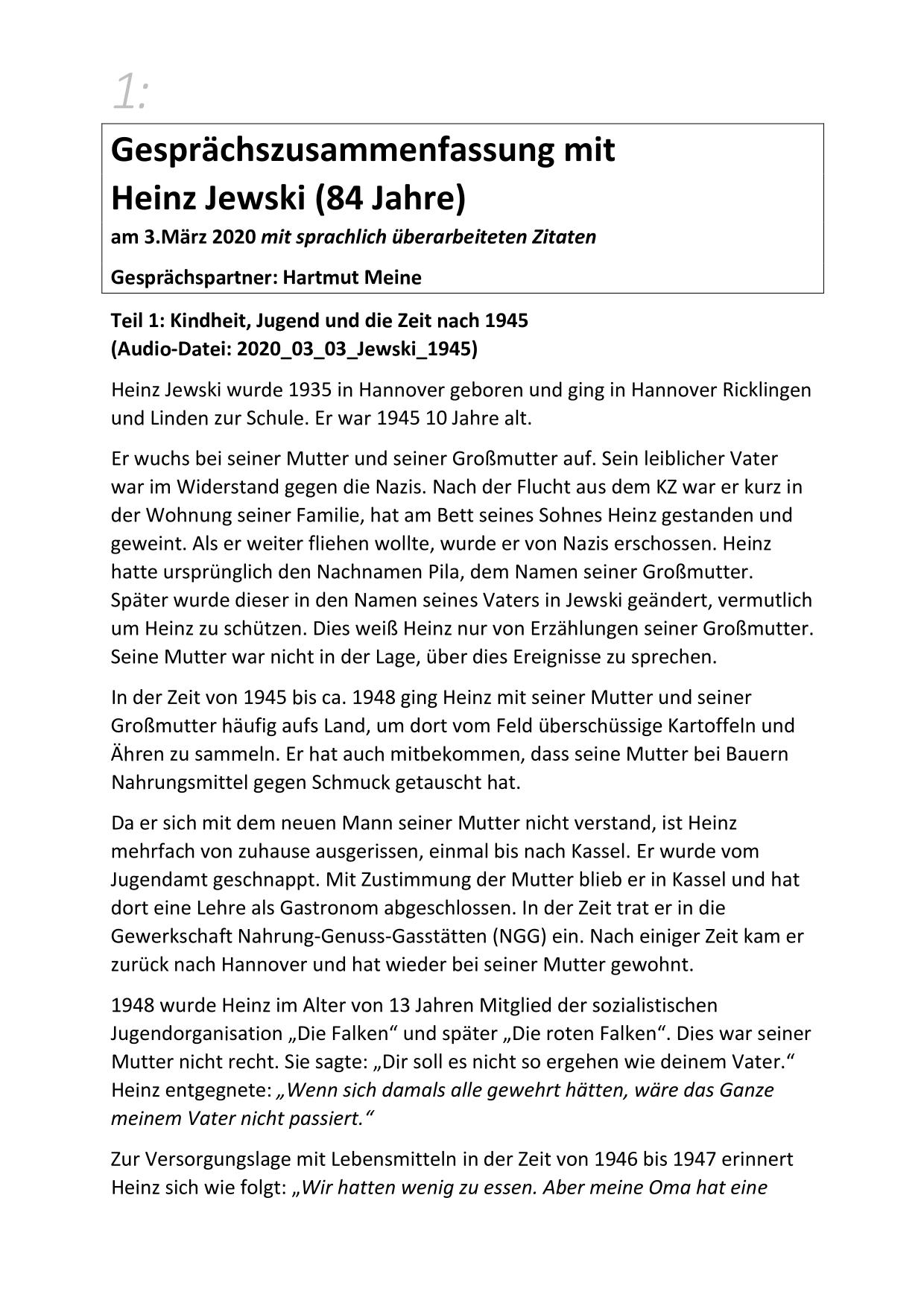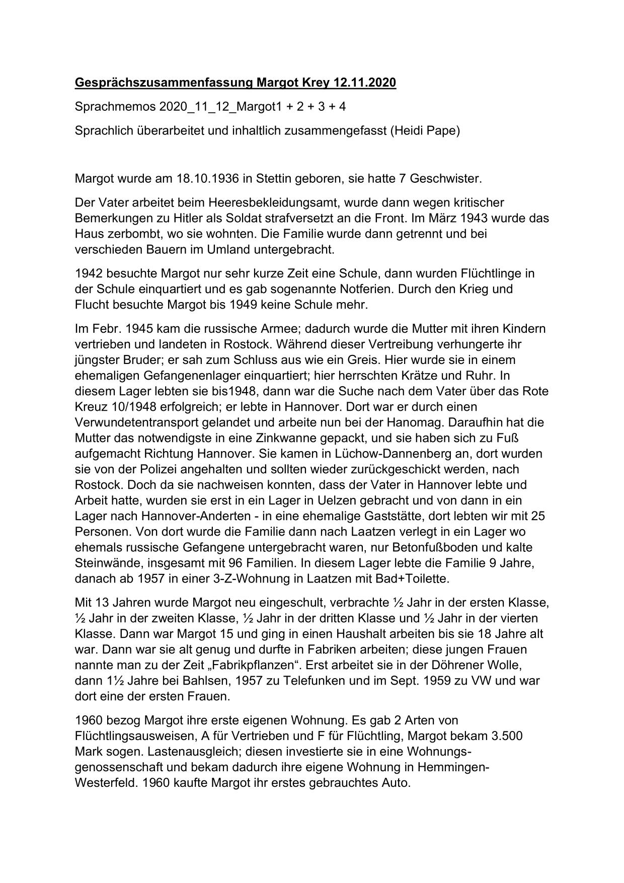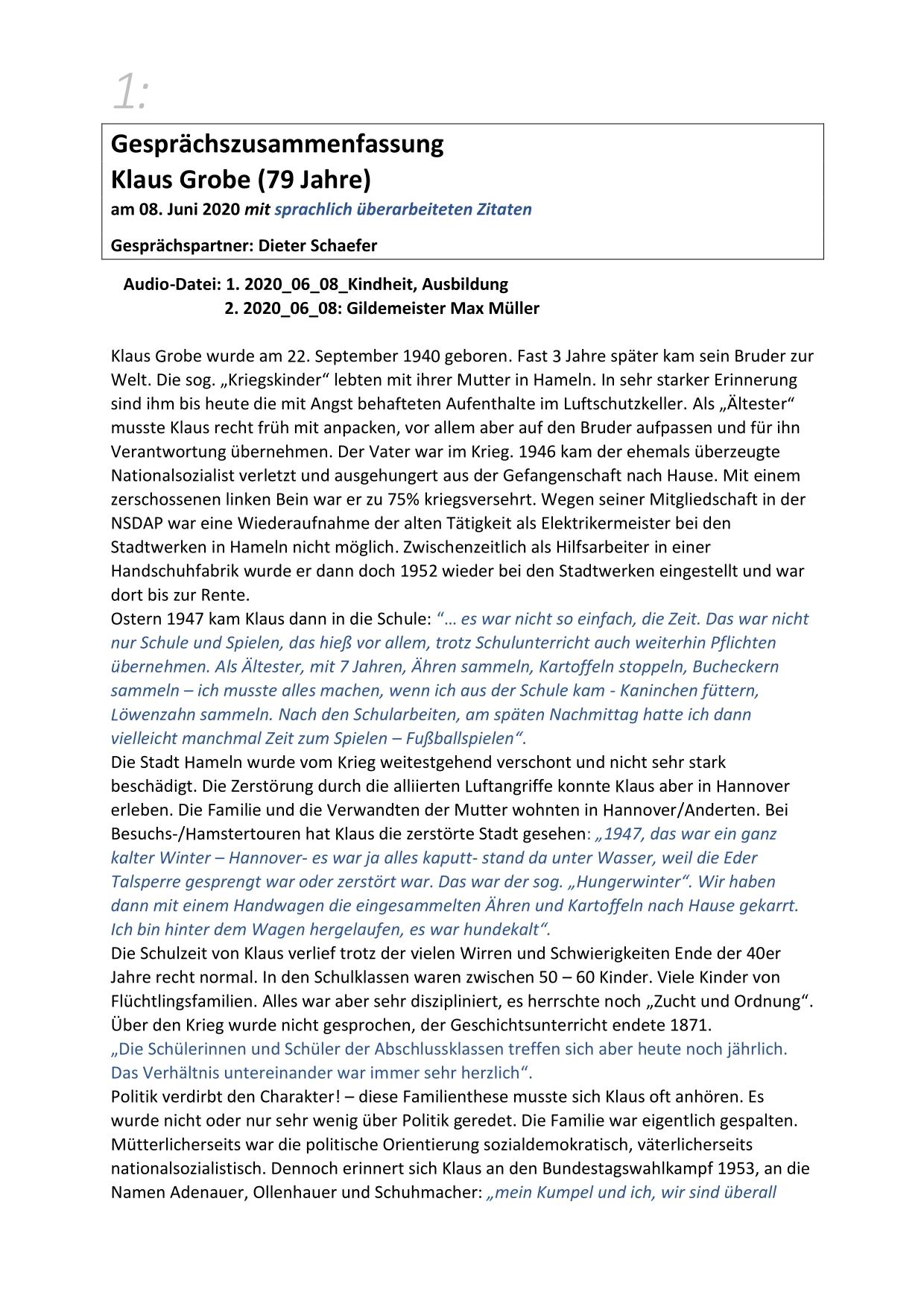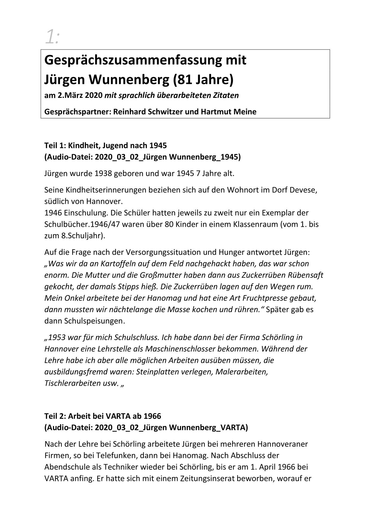 Hier stehen ausführliche Zusammenfassungen der Gespräche mit Zeitzeugen bereit, sortiert nach Nachnahmen.