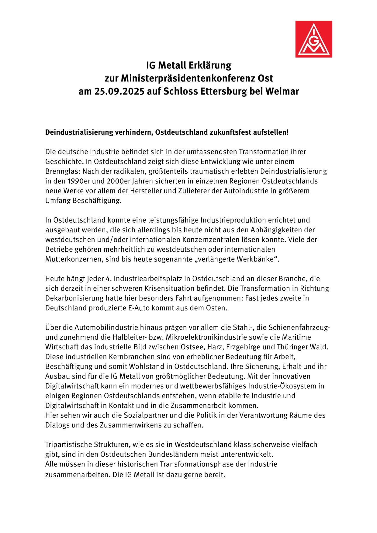 Hintergrund: Insgesamt sind vier der sieben IG Metall-Bezirke in Ostdeutschland vertreten. Dies sind die IG Metall Berlin-Brandenburg-Sachsen, die IG Metall Küste (mit Mecklenburg-Vorpommern), die IG Metall Mitte (mit Thüringen) sowie die IG Metall Niedersachsen und Sachsen-Anhalt. Alle vier Bezirke haben die Erklärung unterschrieben und an die Ministerpräsidentenkonferenz Ost geschickt. Die gemeinsame Erklärung der IG Metall-Bezirke sind dem Anhang zu entnehmen.