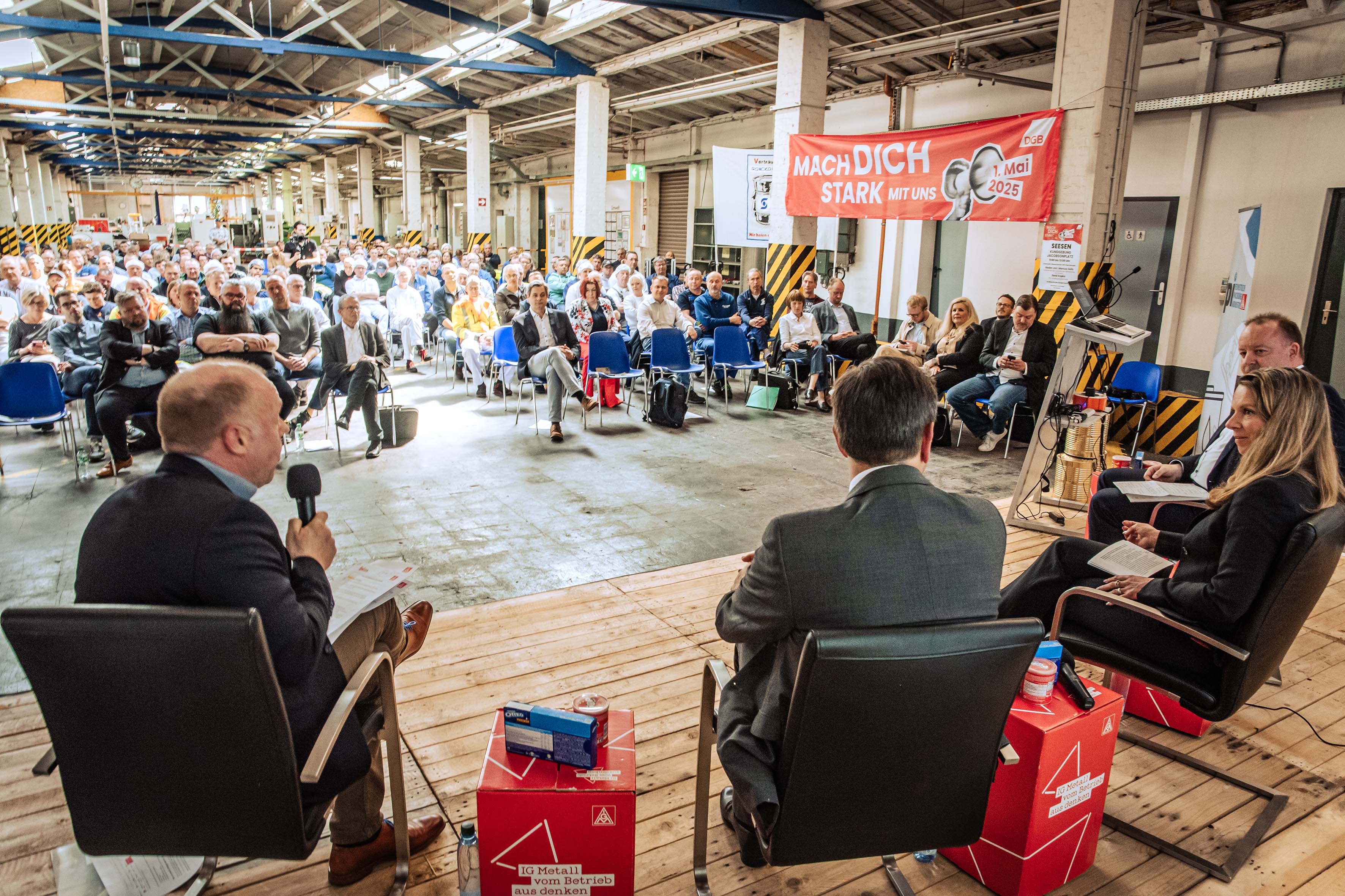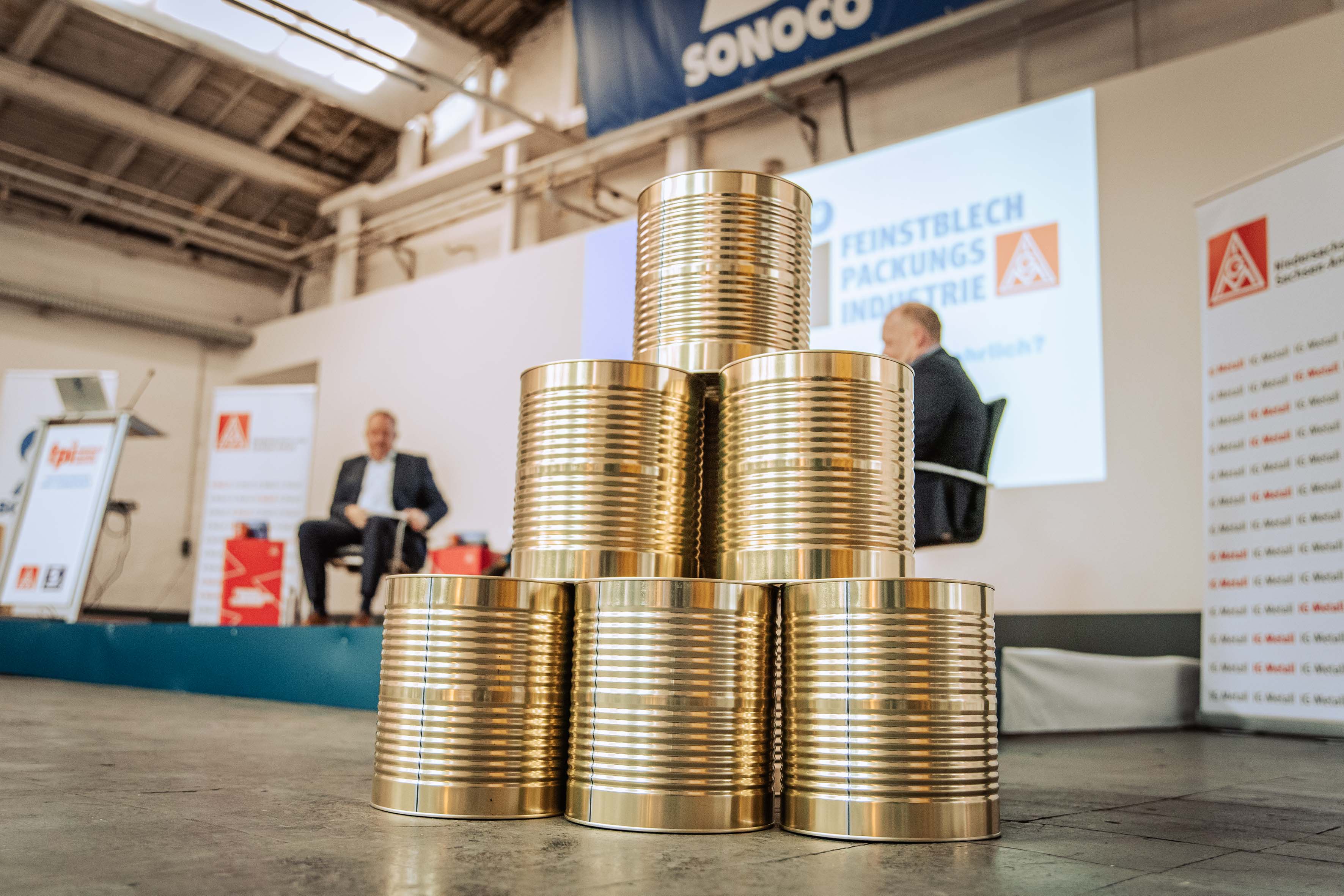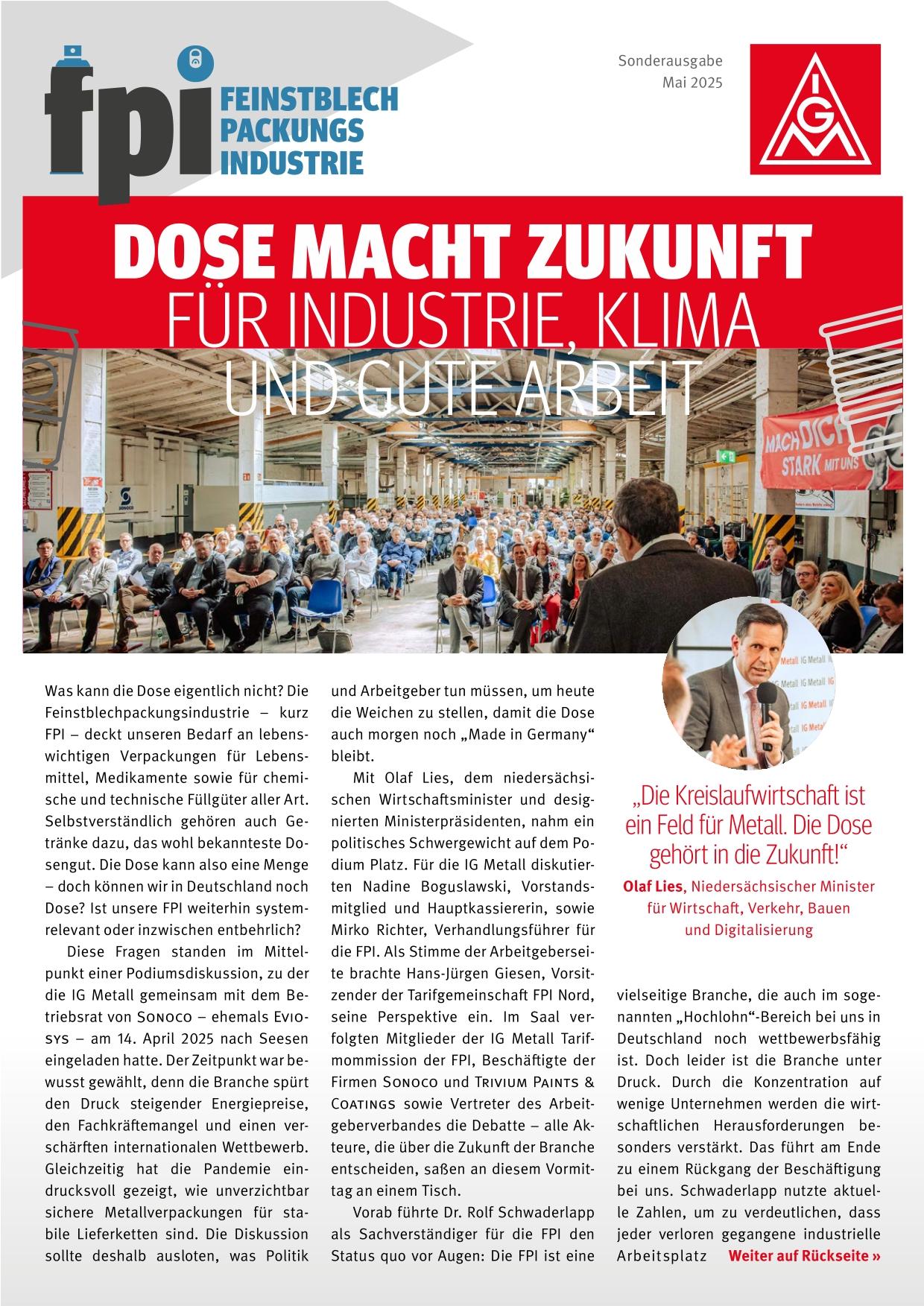 Am Montag, den 14. April 2025, fand bei der Sonoco Metal Packaging Germany GmbH (zuvor: Eviosys) nebst der Betriebsversammlung eine hochkarätige Podiumsdiskussion statt, bei der die ökonomischen und strukturellen Herausforderungen der Feinstblechpackungsindustrie im Mittelpunkt standen.